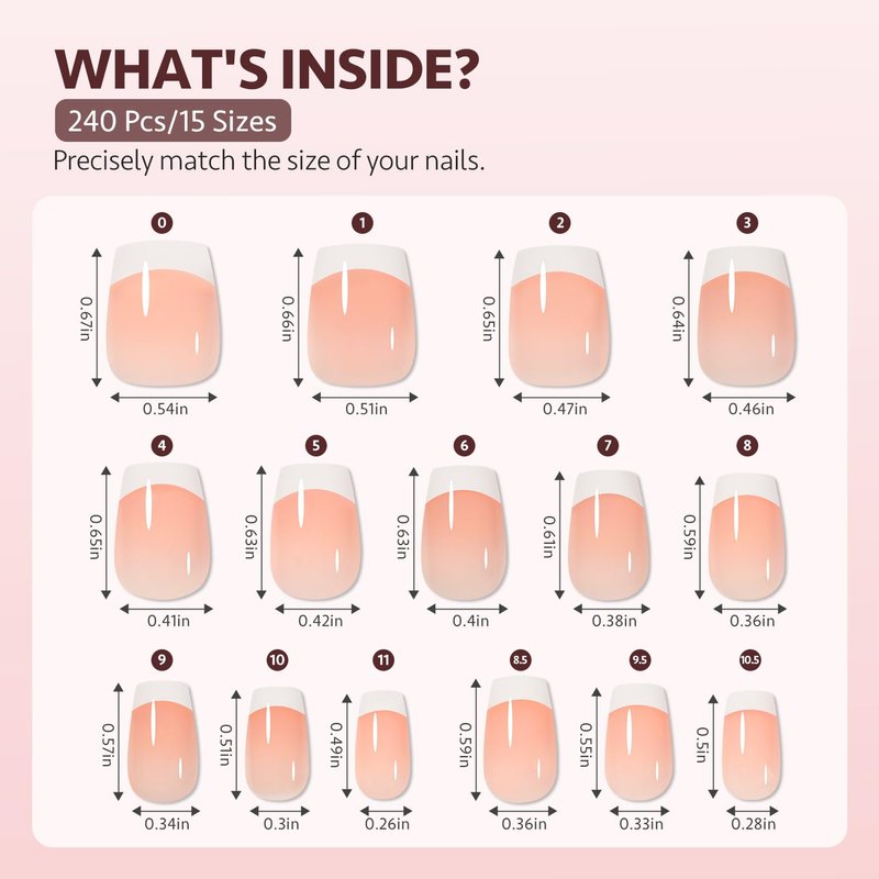 - PACKAGE INCLUDES: More size options, less time spent on filing and adjusting. 240pcs nail tips of 15 sizes for precisely match the size of your nails.