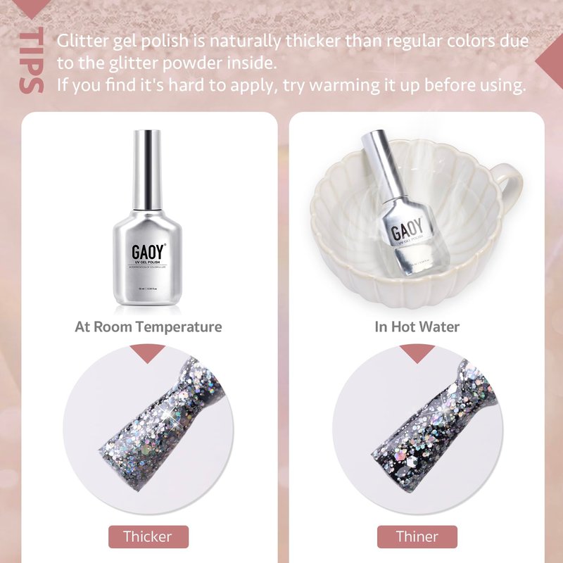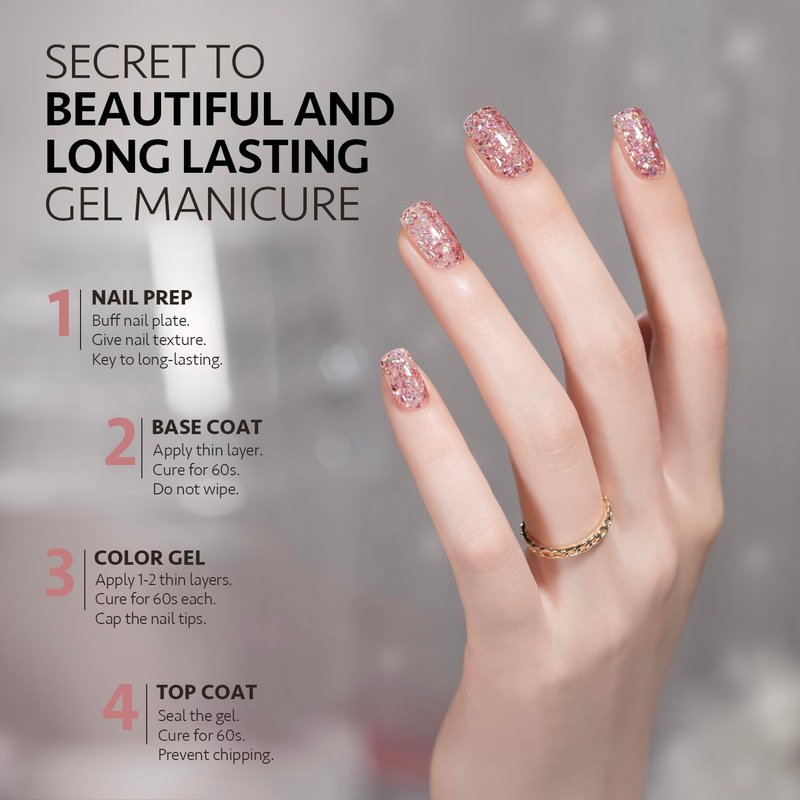 - 4 WEEKS LONG-LASTING: Buff your nail bed before base coat to give your nail texture. Apply top coat after glitter gel for gorgeous shimmery and sparkly finish.