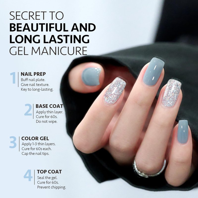- 4 weeks long-lasting: Buff your nail bed before base coat to give your nail texture. Apply top coat after color gel for shiny finish.
