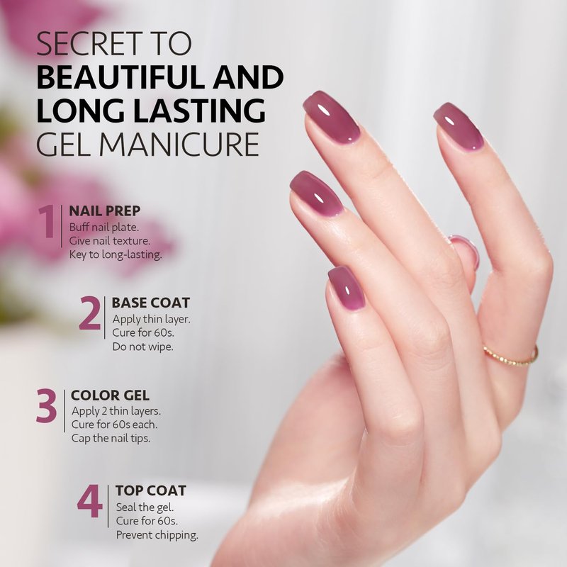 - 4 WEEKS LONG-LASTING: Buff your nail bed before base coat to give your nail texture. Apply top coat after color gel for shimmery jelly finish.