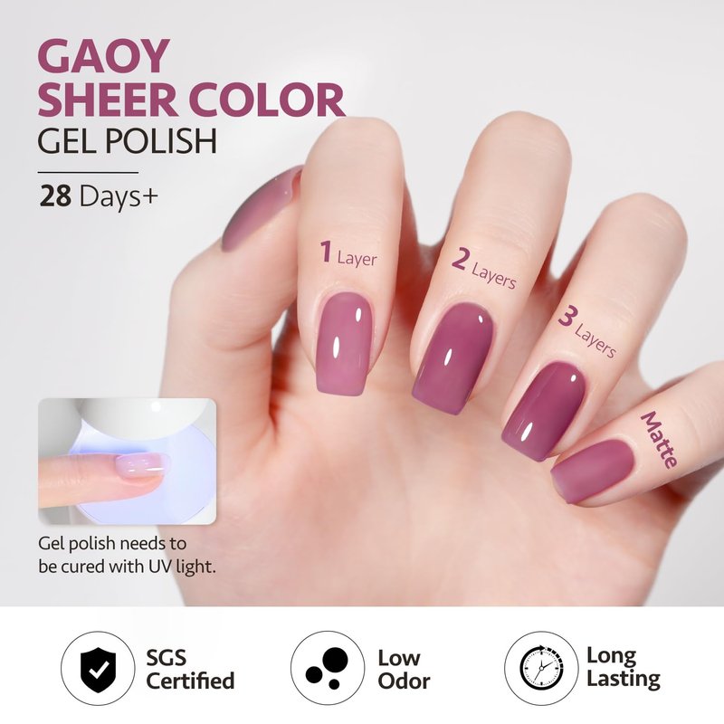 - SHEER GEL POLISH: Apply several layers to build up the color from clear transparent to solid opaque.