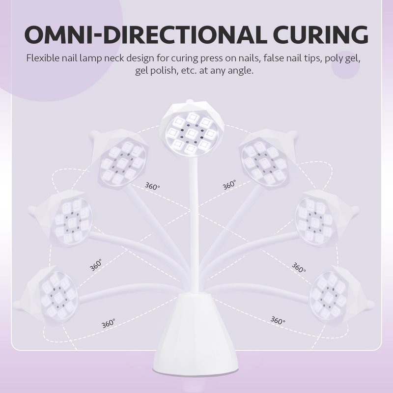 - OMNI-CURE: Flexible nail lamp neck design for omni-directional curing. Ideal for curing press-on nails, false nail tips, poly gel, gel polish, etc. at any angle.