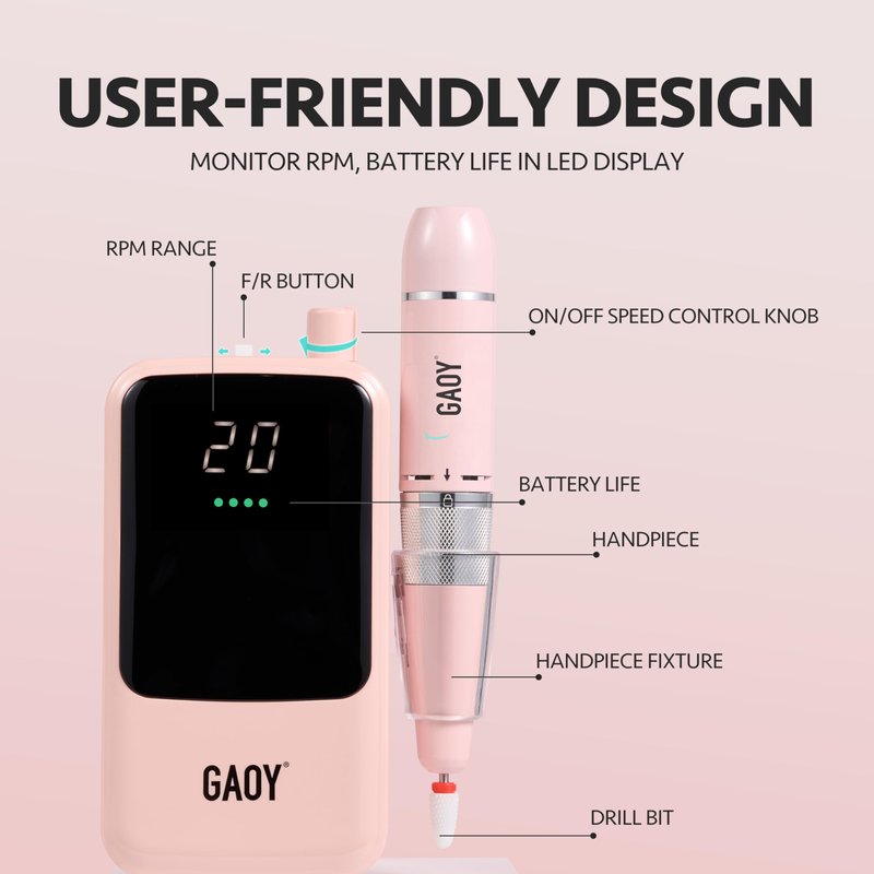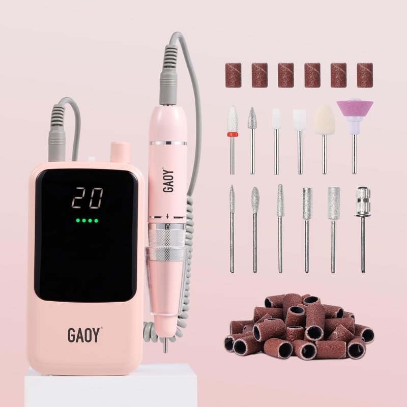 GAOY Rechargeable Cordless Nail Drill for Beginners, Electric Nail File with 12 Nail Drill Bits and Sanding Band Set for Acrylic and Gel Nails, Pink