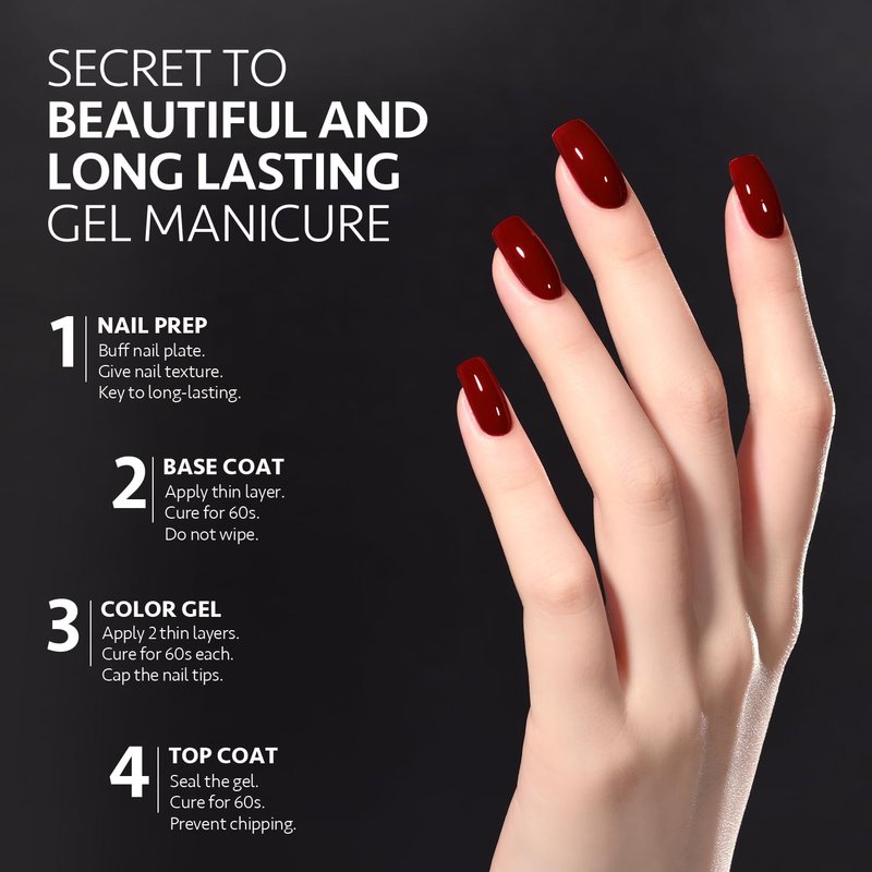 - 4 WEEKS LONG-LASTING: Buff your nail bed before base coat to give your nail texture. Apply top coat after color gel for shimmery jelly finish.