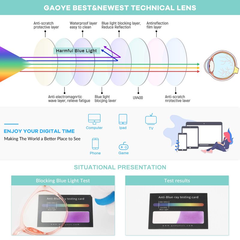 - [Bluelight Glasses] Blue light blockers with UV400 lenses block 100% harmful blu-ray & UVA/UVB rays, reduce discomfort from vedio, tv, phone, laptop, computer gaming or working under fluorescent lights; Protects your vision, help you anti glare, headache, eye strain, dry eye and sleep better