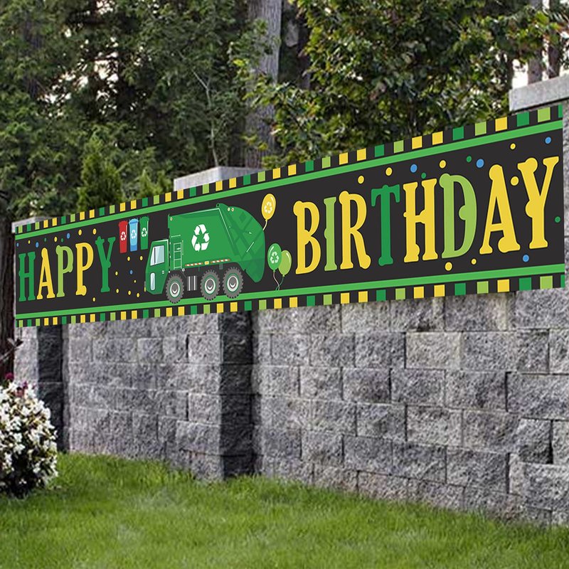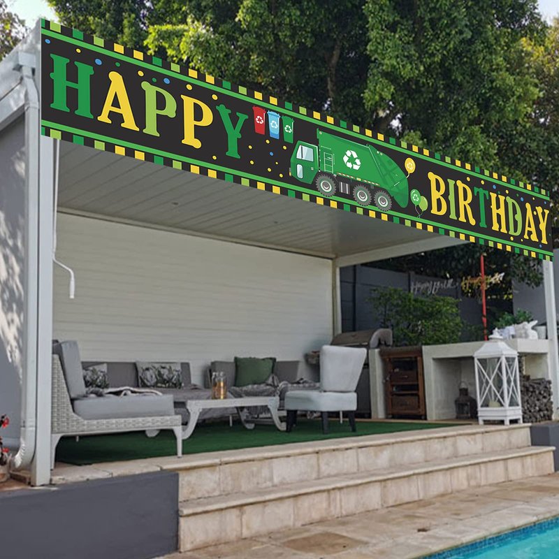 Garbage Truck Trash Trucks Happy Birthday Banner Backdrop Balloons Waste Management Recycling Bin Theme Decor Decorations for Yard Sign 1st Birthday Party Baby Shower Supplies Favors Background Flag