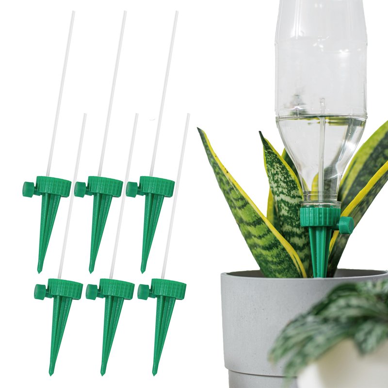 With our plant waterer, don't need to worry about your plants withering during travel for business or travel on holiday. No Need to Poke Holes or Cut Bottle The upgraded watering spikes do not need to poke holes in the bottom of the bottle when in use. The most important thing is that it will not stop watering due to the influence of water pressure. Adjustable Flow Speed Design This plant watering device consists of a slow-release control valve switch, self watering spikes will not become blocked by mud. Only adjust the valve to Meet your needs without complicated setup steps. Long Time Continuous Auto Watering Enjoy Your Vacation These self watering spikes can accurately calculate the flow of water, provide different amounts of water for different plants and flowers, avoid watering too much or too little. 600ml water supply time about 1-7 days 1500ml water supply time about 7-16 days Enjoy your holiday with your family, leave your plants to our plant waterer, self water your plants and vegetables, and make your plants thrive. How to Use 1. Fill the bottle with water. 2. Assemble all parts the product together. 3. lnsert the assembled dripper into the the filled bottle, then hold the water bottle upside down vertically. 4. Place the plant waterer into the soil surrounding your plant, and then adjust the dripping speed. Specificationļ¼ Material: PP plastic Color: green Package Include: 6x Self watering spikes (6green) 6x straws