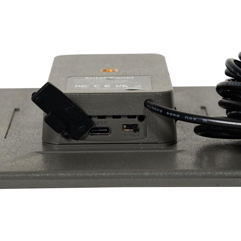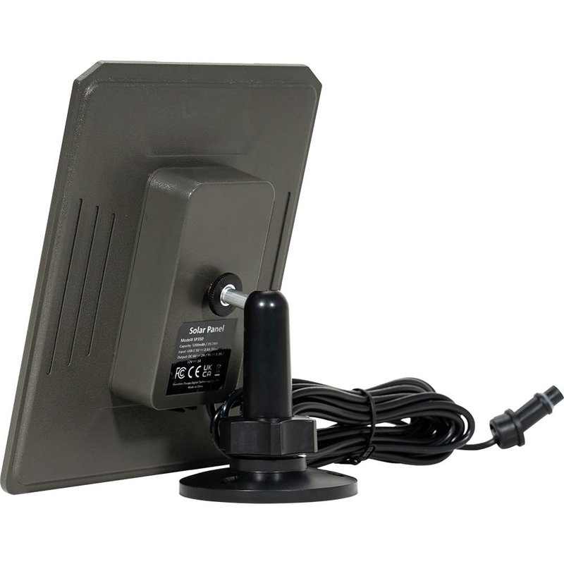 The SP350 solar panel is designed to charge specified models of trail cameras. The solar panel has a built-in rechargeable lithium battery. When using the solar panel for the first time, please place it under direct sunlight or use a USB Type-C charger cable connected to a power adapter that outputs 5V (or has a 5V option) to ensure a full charge. Note: the USB Type-C charger cable and the power adapter are not included in the package.