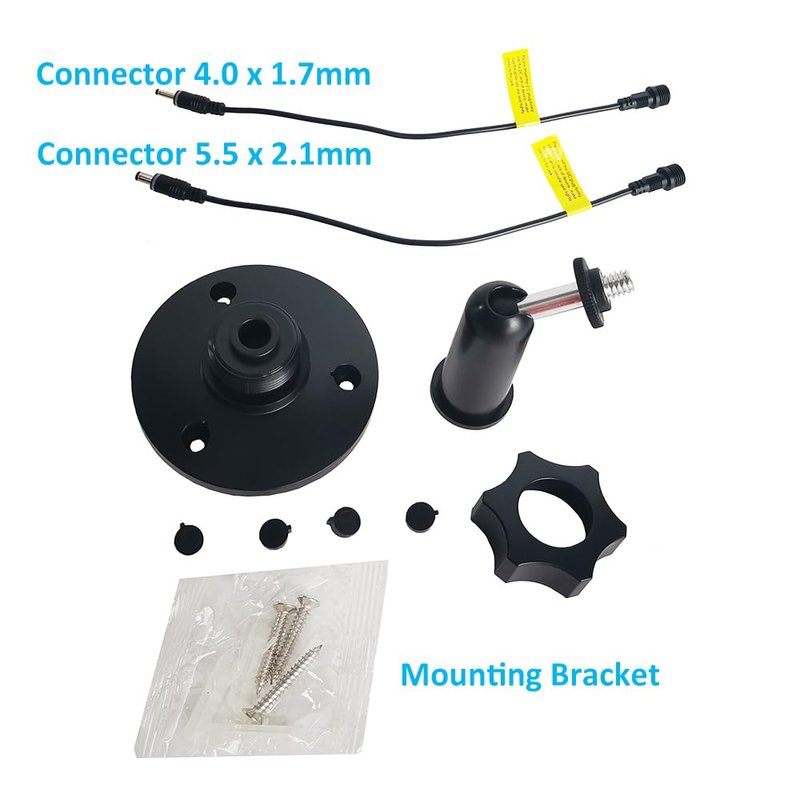 - Package includes: 1 x Solar Panel, 1 x DC output connector (4.0 x 1.7mm), 1 x DC output connector (5.5 x 2.1mm), 1 x Mounting Bracket, 3 x Screws, 1 x Instruction Manual