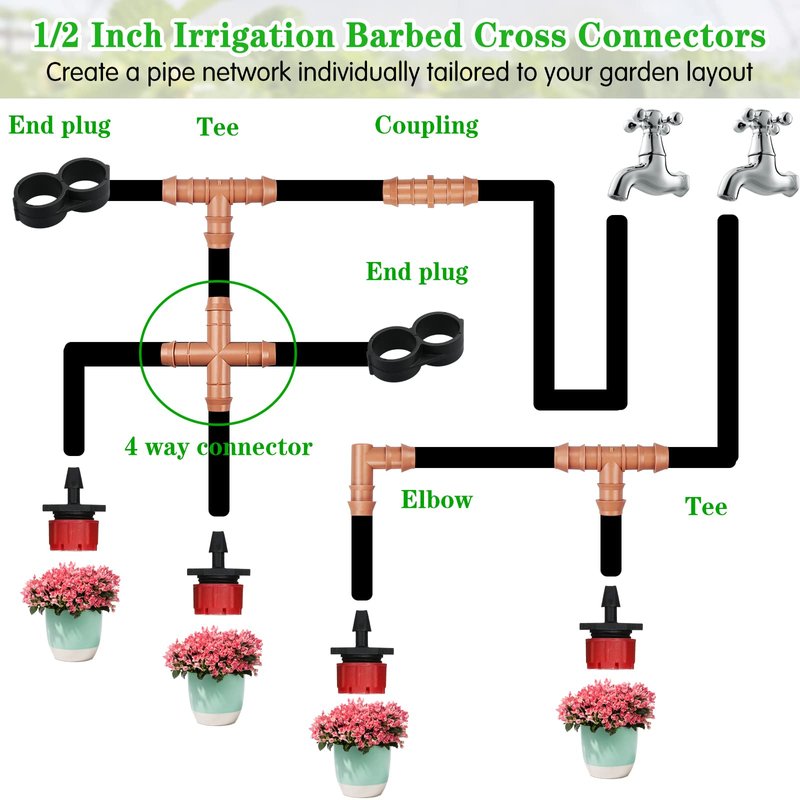 Gardrip drip irrigation barbed cross tee fitting fits 1/2" drip irrigation tubing perfectly. This barbed 4 way cross connector is designed to quickly and easily connect quarter inch drip irrigation tubing. This set of 1/2 inch drip tubing connectors is a great value and all of the pieces seem well-formed, without any flashing or other glitches. High quality barbed connectors grab all brands of 1/2 inch. drip tubing tightly, creating a fast, leak-proof connection that stays in place full irrigation system life. It works perfectly to repair or extend tubing in a drip irrigation system - the 1/2 inch hose slides on easily and stays on without leaks. With this 1/2 inch coupling fittings, you can evenly waters trees, shrubs, flower beds, vegetable gardens, potted plants, and hanging baskets. As part of a complete garden irrigation system kit, drip irrigation fittings kit are connectors that attach sections of tubing together, or attach tubing to other drip irrigation parts. A necessity for drip irrigation systems, ideal for making repairs to or customizing drip watering systems.