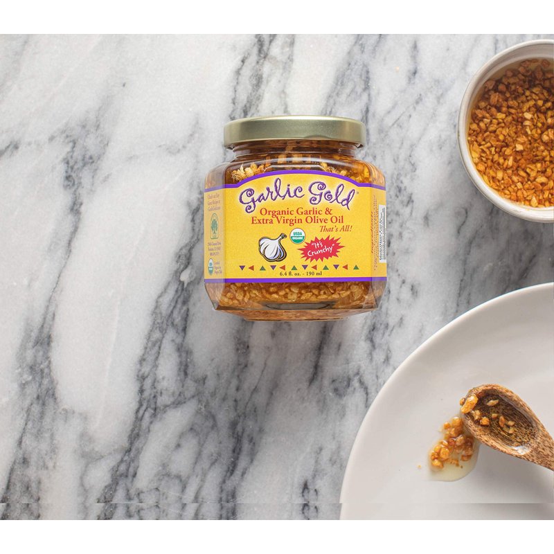 Toasted, crunchy, organic garlic mixed with organic extra-virgin olive oil. Drizzle on bread and toast/grill for an easy and delicious garlic bread. This versatile condiment can be used on any of your favorite dishes including pasta, steamed vegetables, steaks and more. Share it with your friends; makes a great hostess gift. Just spoon it on and turn your meals into a gourmet experience Use in place of butter, minced garlic, plain olive oil