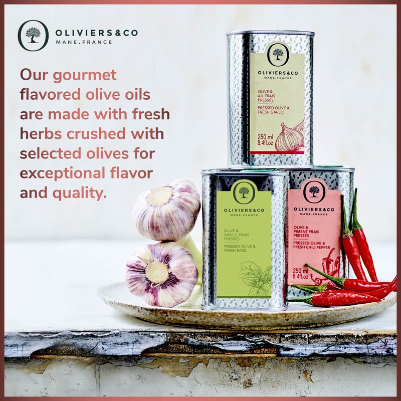 - OLIVE OIL Extra Virgin Olive Oil is enriched when paired with fresh garlic, two essential ingredients in Mediterranean cuisine. Garlic brings all its intensity and rich umami flavor to uplift and enhance a gourmet flavored olive oil. Enjoy the taste of Italy with Oliviers & Co's Garlic Olive Oil.