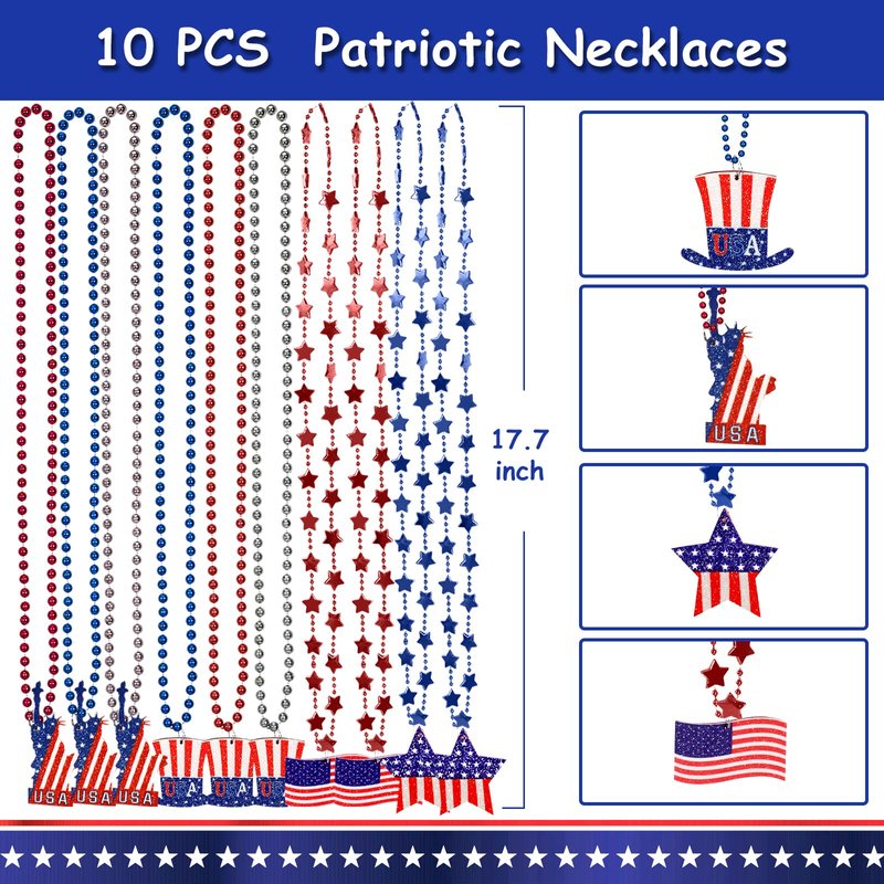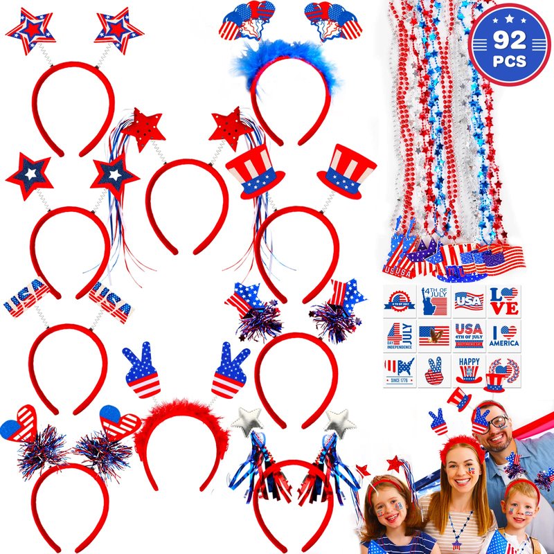 - Great Value Pack - Our 4th of July party favors set include 10Pcs Patriotic Head Boppers headbands(10 Styles), 10Pcs Patriotic Beaded necklaces (4 Styles) and 72pcs Patriotic temporary tattoo stickers (12 Styles) for 10 people. Totally 92pcs 4th of july accessories. Novelty patriotic party favors have everything you need to create a memorable celebration for your 2023 USA Independence Day party!