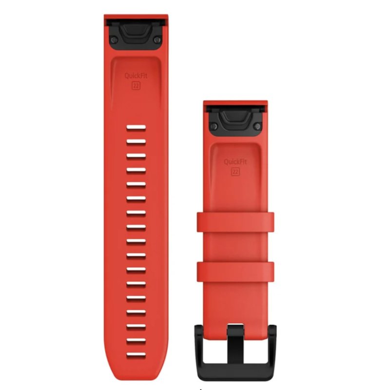 Garmin QuickFit Silicone Red Straps - 010-12901-02. This Garmin watch strap is made of silicone and is attached to the watch by means of pushpins. The band has a width of 22.0 mm and is closed by means of a buckle. The strap has a straight mount which means that this strap is suitable for all Garmin watches with a straight mount.