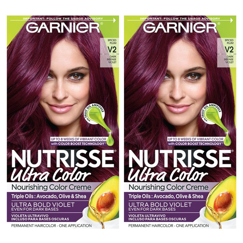 Garnier Hair Color Nutrisse Ultra Color Nourishing Creme, V2 Dark Intense Violet (Spiced Plum) Purple Permanent Hair Dye, 2 Count (Packaging May Vary)