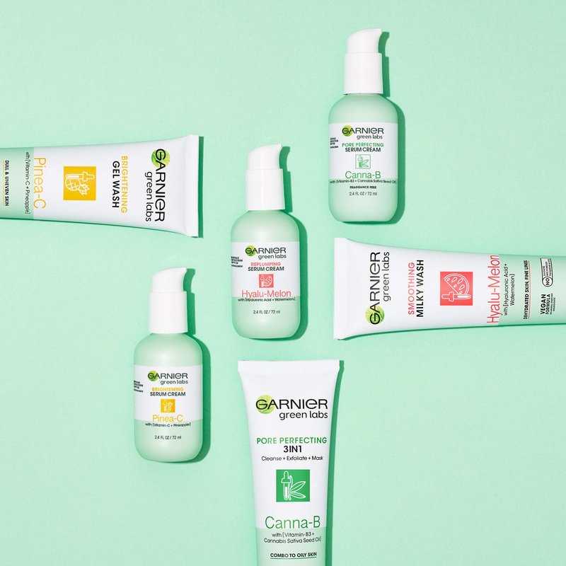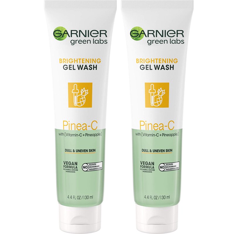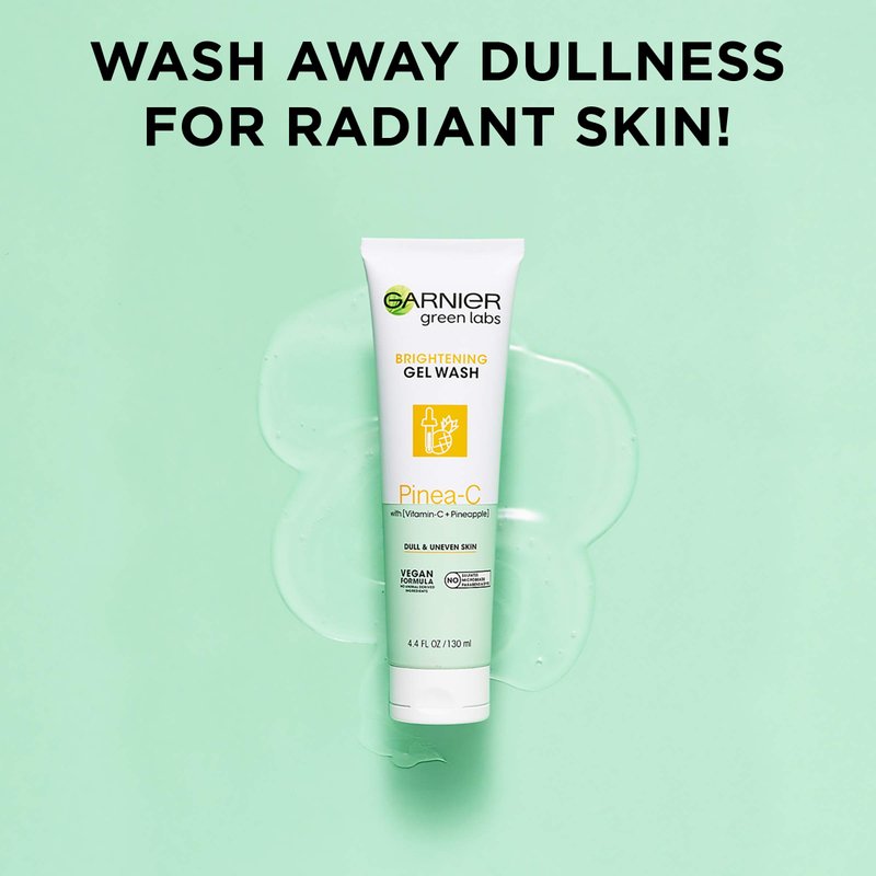 - Garnier Green Labs Pinea C Brightening Gentle Scrub Free Wash removes makeup and impurities and smooths skin texture for brighter, glowing skin