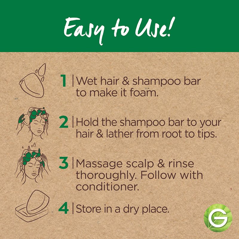 - How To- 1 Wet your hair and the solid shampoo to make it foam- 2 Hold the shampoo bar to your hair and lather from roots to tips- 3 Massage scalp and rinse off, Follow with conditioner- 4 Store in a dry place