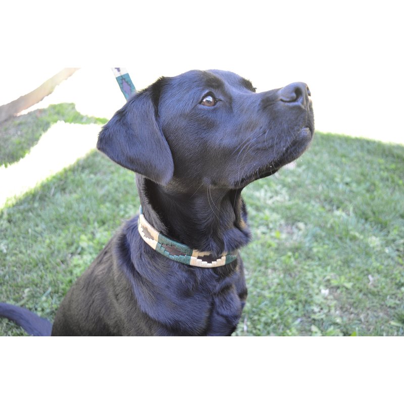 The 'Palm Desert' leather dog collar is a subtle design in our dog accessories collection. The collar has been stitched with green and cream wax threads.