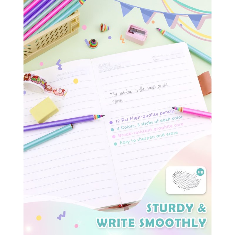 - 【Valued Package】: The box of rainbow pencils for kids with 12pcs fun pencils with 4 colors, 1 cute case for organized and ready to use.