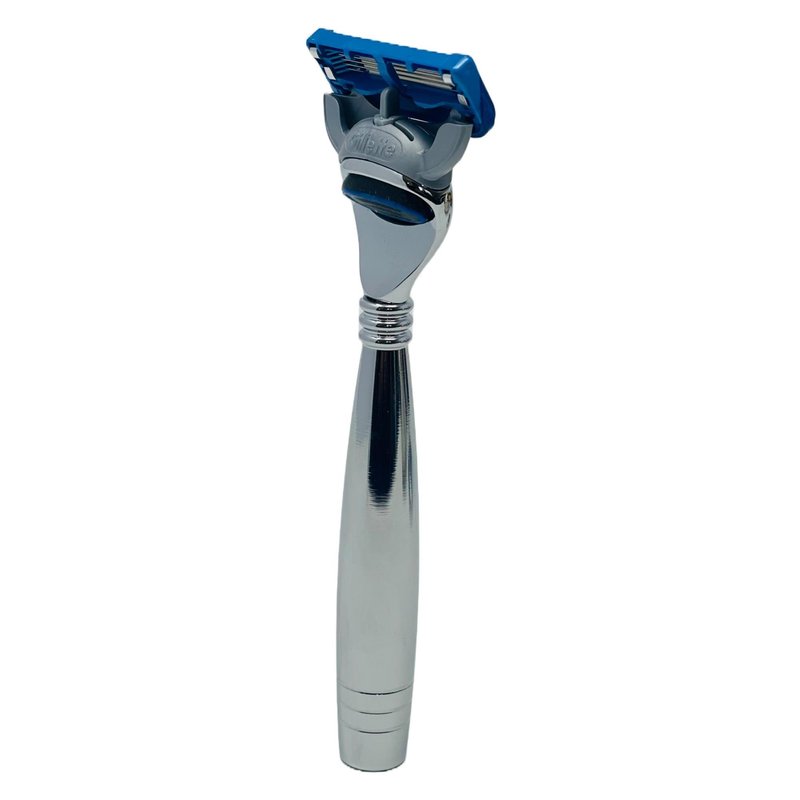 - MULTI BLADE LONG HANDLE CARTRIDGE RAZOR - 5 blade compatible razor with precision trimmer - blades are spaced closer together for less irritation, helps reduce pressure per blade. Responds to contours, getting virtually every hair. The multiple blades and lubricating strip provide a close, smooth shave without cuts or razor burn. A handsome Chrome long handle has a classic, timeless design. Great Cartridge razor. Well Balanced for an easy safe shave. Ergonomic design