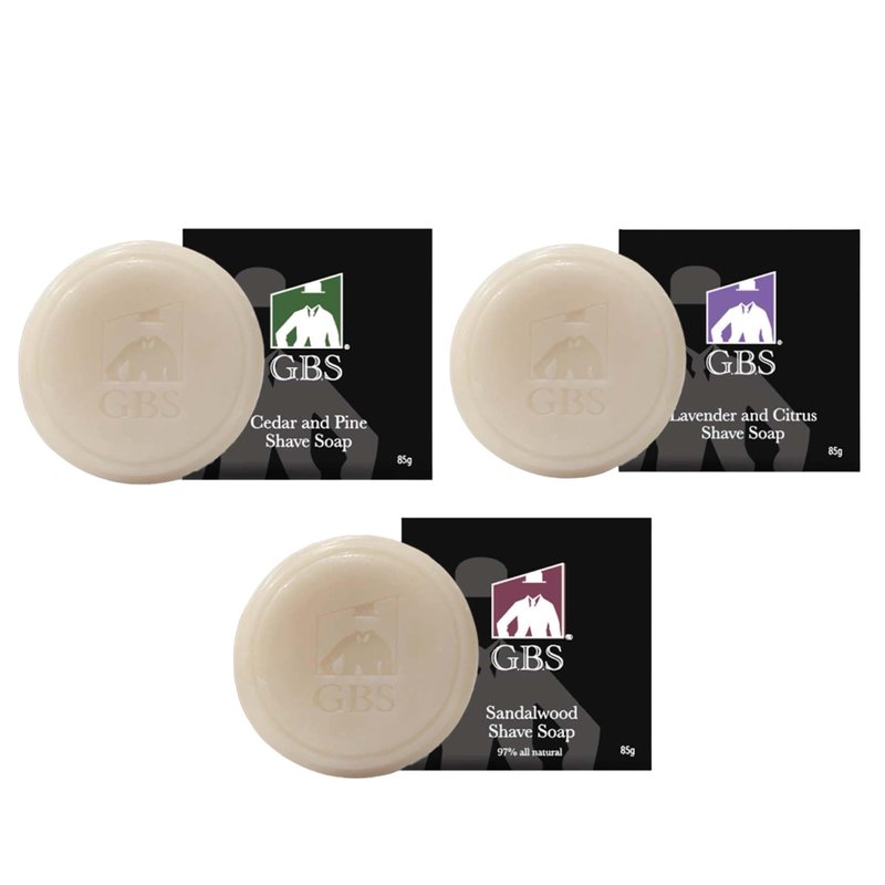 - G.B.S Men's Shaving Soap is in a package, 1 sandalwood shaving soap, 1 lavender and citrus, and 1 cedar and pine
