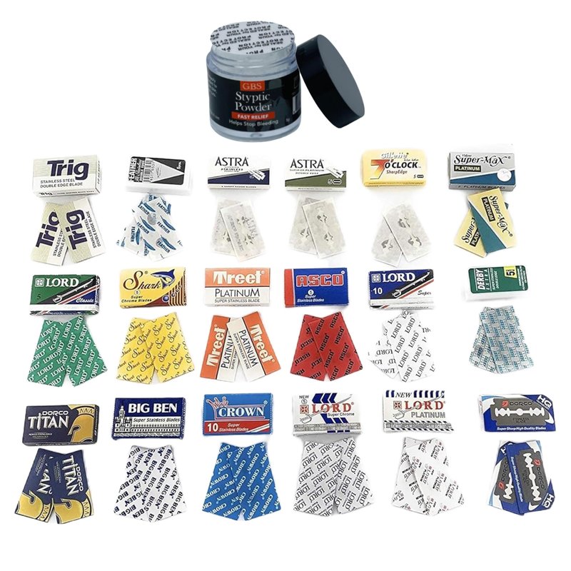 G.B.S Sharp Blades and Styptic Powder Jar, Stops Bleeding From Shaving Nicks and Cuts Soothes Skin and Pore After Shave, Pack of 36 Double Edge Razor Blade Refills. Assorted variety pack so you can try out different blades and find your favorite! Includes a travel sized Jar of Styptic Powder you can use in case you get a nick or a cut while shaving, the styptic powder stops bleeding instantly. The perfect double edge variety sample pack for new or experienced shavers!