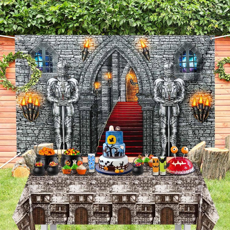 2 Pcs Medieval Party Decorations, Medieval Scene Setter Set, Castle Backdrop with Halloween Brick Stone Wall Tablecloth, Knight Themed Castle Decorations for Party Table Wall Decor