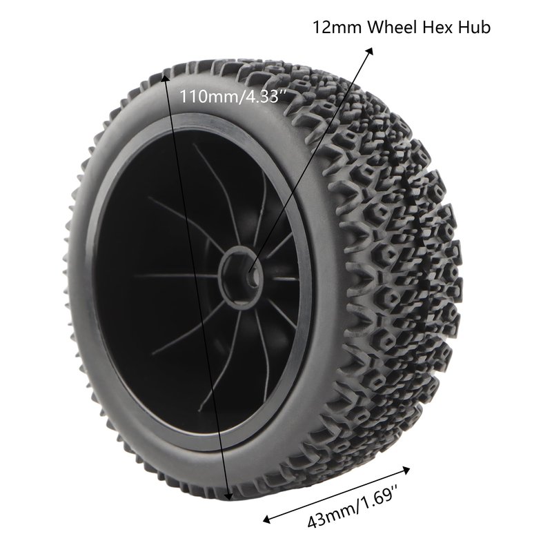 - 🔥【RC Tires Dimension】The size of 1/10 RC Off Road Car Tires Wheels, Outer Diameter: 4.33" (110 mm) | Width: 1.69" (43mm) | Hex Size: 12mm. " Please make sure our RC tires and wheels are the correct sizes you are looking for, to avoid the returns products and save your time due to the inconsistent size.