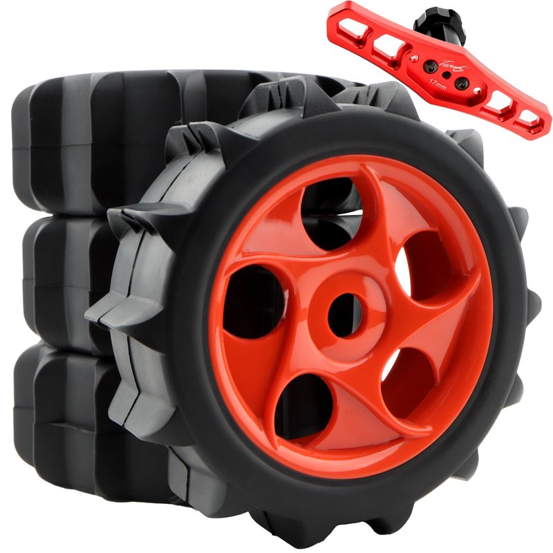 GDOOL 4 Pieces 1/8 Scale RC Buggy Paddle Tires Hex 17mm Wheels & 17MM Hex Nuts Sleeve Wrench Metal Tools for Traxxas Arrma Typhon 3S 6S Losi HPI Redcat Snow Sand Desert Off Road Car (Red)