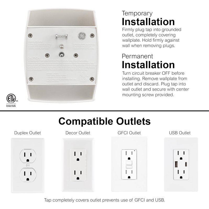 - Power More – Turn two outlets into six with this grounded wall tap to power your home or office electronics