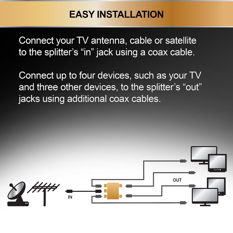 - Convenient multipack – Package includes two coaxial cable splitters that distribute the digital signal from a TV antenna, cable or satellite connection or other device to multiple TVs or other components equipped with F-type coaxial cable connectors