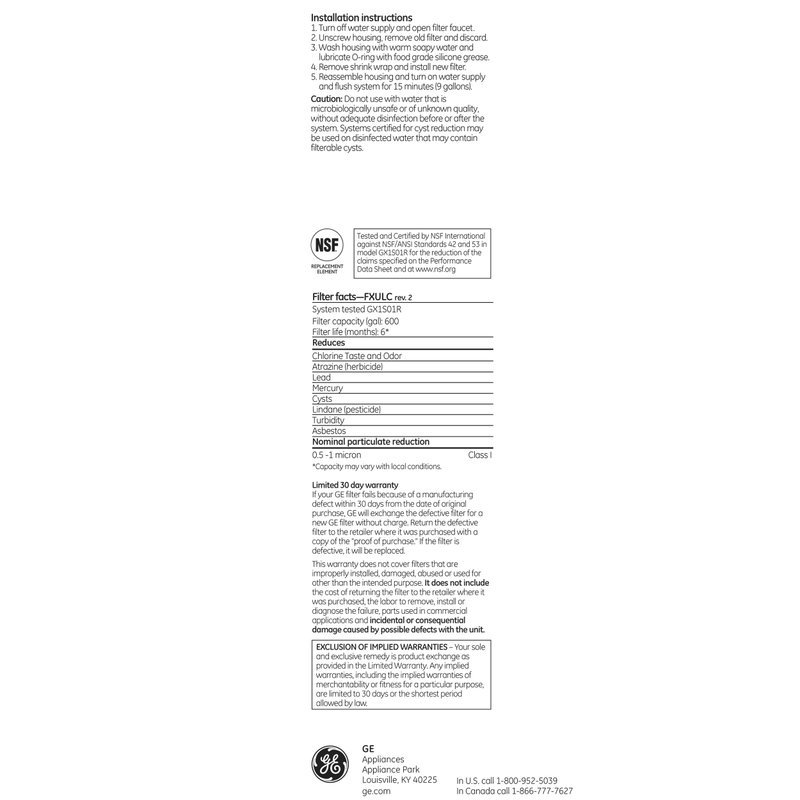 GE FXULC Drinking Water System Replacement Filter White, 9.00 x 2.00 x 2.00 inches