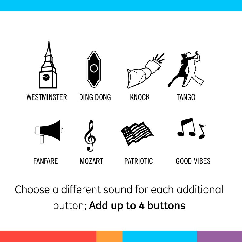 - Expanded Network – Up to four GE-branded push buttons (additional buttons sold separately) can be paired to the receiver within the 150ft. range, and a melody can be selected for each button, so you know where to greet visitors