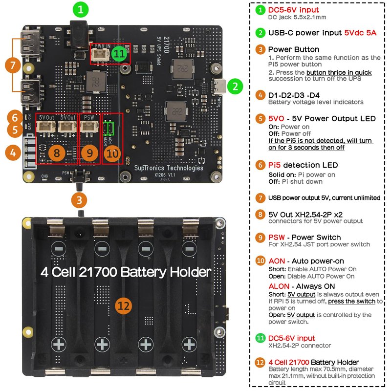 - Compatibility: Pi 5 UPS compatible with Raspberry Pi 5 16GB/8GB/4GB/2GB; Model: X1206; Matching Case is X1206-C1