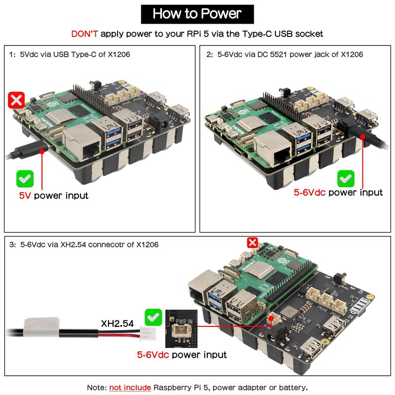 - How to Power: Power via X1206 5Vdc 5A USB-C port(recommend) or power 5-6Vdc via DC5521 jack of X1206; Do not use 9-18V power via the DC5521 jack, as it may damage the board