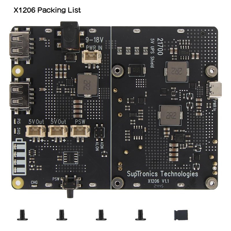 - Packing List: 1x X1206 5V UPS Shield, 1x Screws Pack (Not include Raspberry Pi 5 , batteries or power adapter)