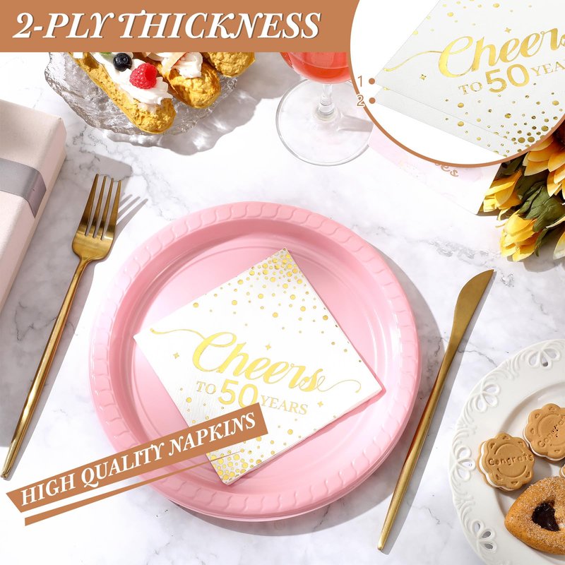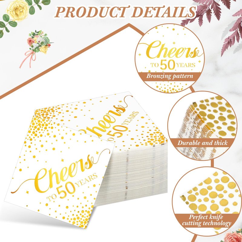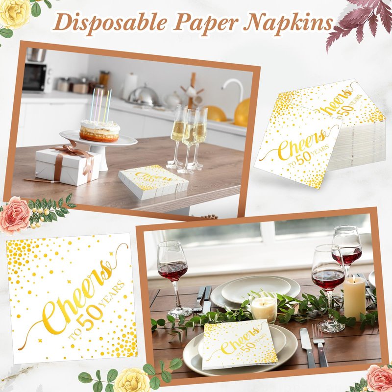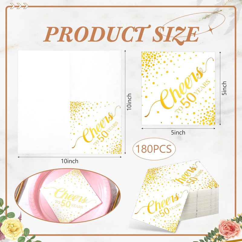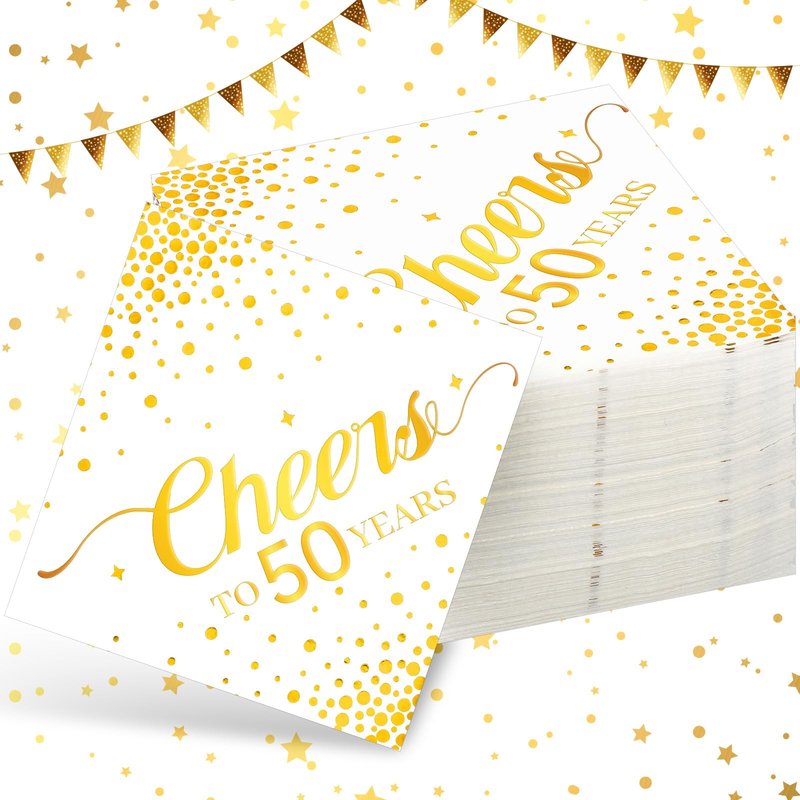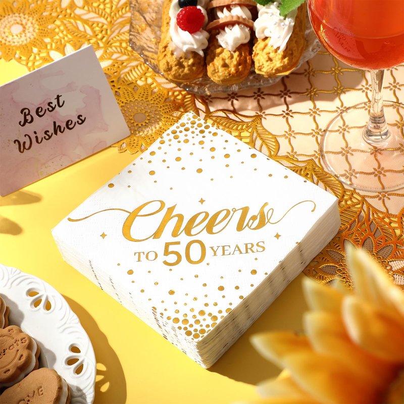 Geelin 180 Pieces Cheers Napkins Gold Cocktail Napkins Beverage Paper Napkins Disposable Bar Napkins for Wedding Reception Anniversary Birthday party Decorations, 5 x 5 Inch(50 Years)