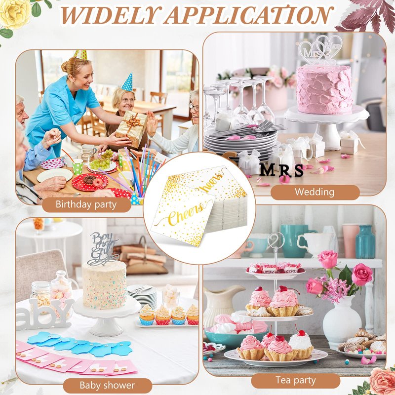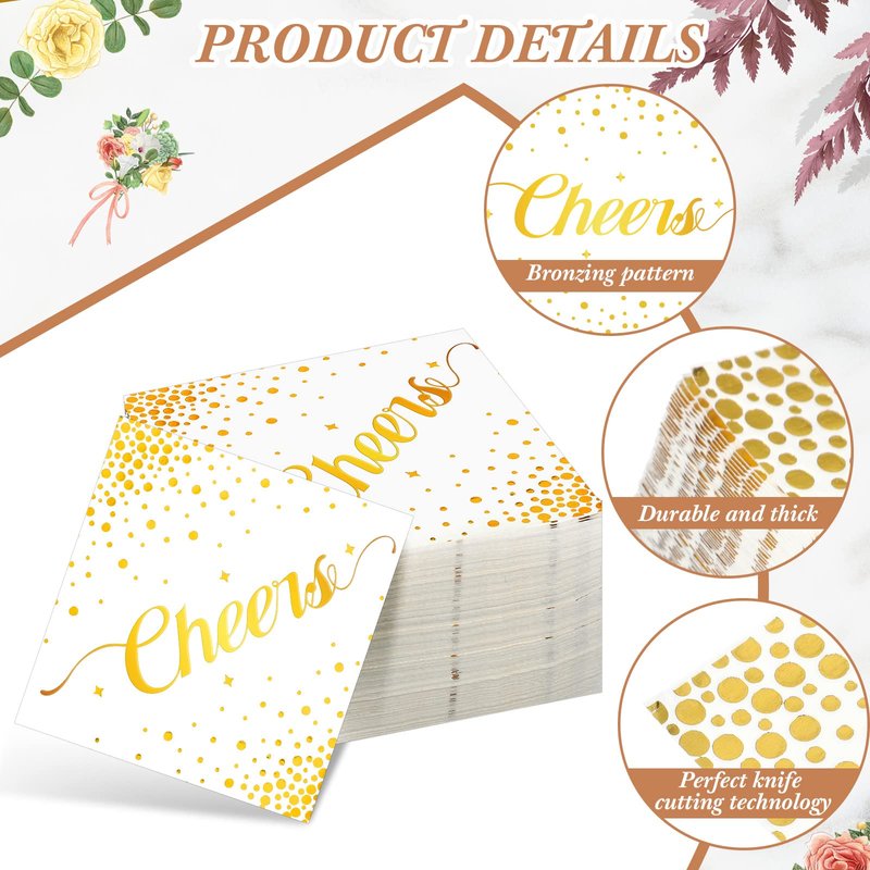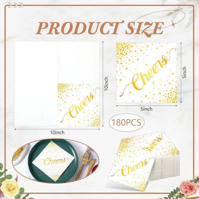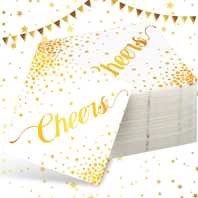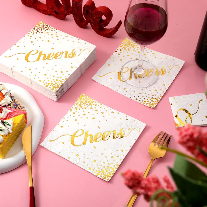 - Elegant Design: our gold cocktail napkins are designed with classic foil stamped dots and the word "Cheers"; These elegant and beautiful napkins can be matched with a variety of themes, and their sophisticated look is sure to give your guests a lasting impression at formal events or any occasion