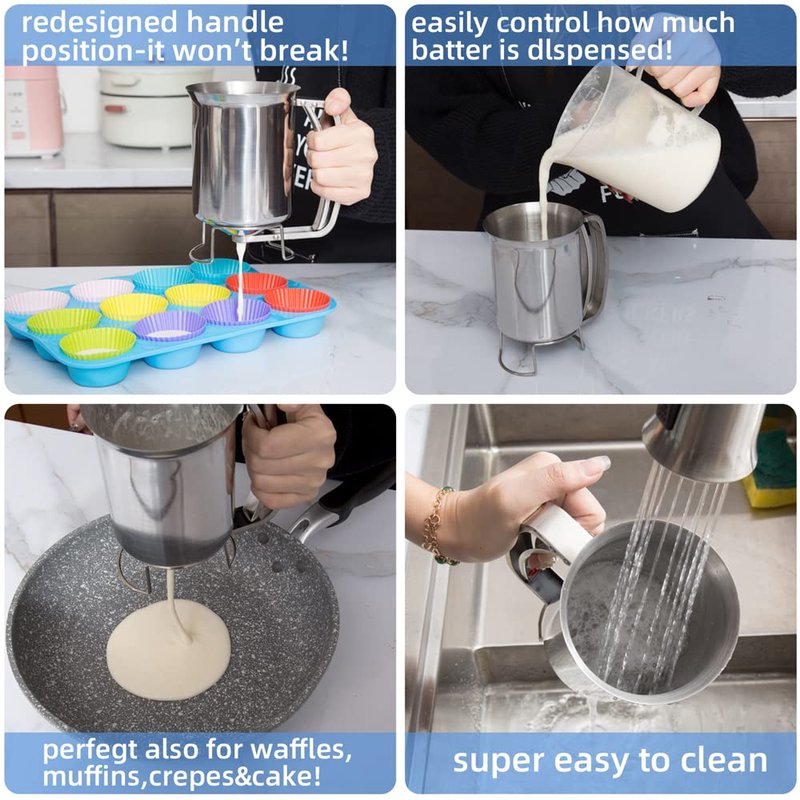 - 3: Less Mess- The drip free opening and clossing nozzle on your batter dispenser reduces messes by kepping your pancake, cupcake,or muffin batter from dripping onto your counters. Clean up will be a snap with this handy baking utensil.
