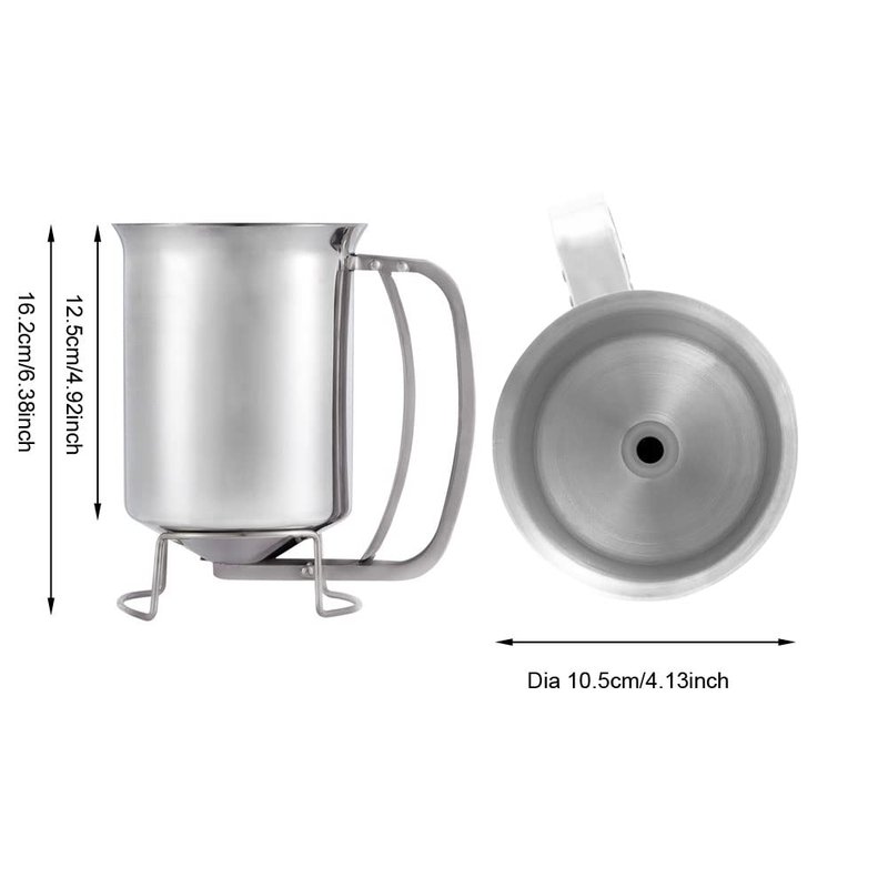 Size: 4.13inch(W)*6.37inch(H-including legs)4.92inch(H-cylinder only) Material: 18/0 Stainless Steel Capacity: 800ml(24 ounces of 3 Cups) Equipped with: Spring loaded handle, with open and close dispenser nozzle.