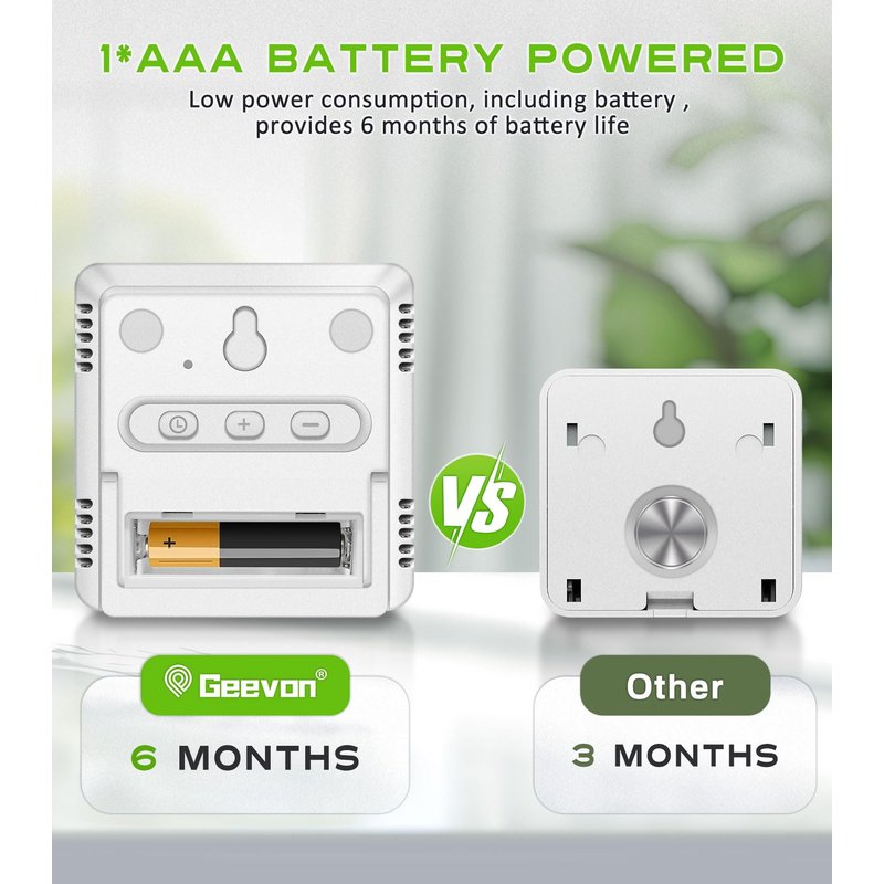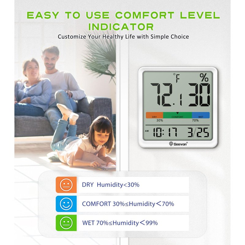 Comfort Level Indicator Always be aware of the changes in your home with just a quick glance at the comfort level icon. Know when to dehumidify or humidify now!Great for monitoring family's living conditions and health by preventing colds, dry skin, asthma, allergy, mold. Long Battery Life Indoor temperature and humidity monitor is powered by one powerful and commonly found 3A battery that provides 18-24 months of battery life. When you do need to change the battery, it’s easily replaceable.