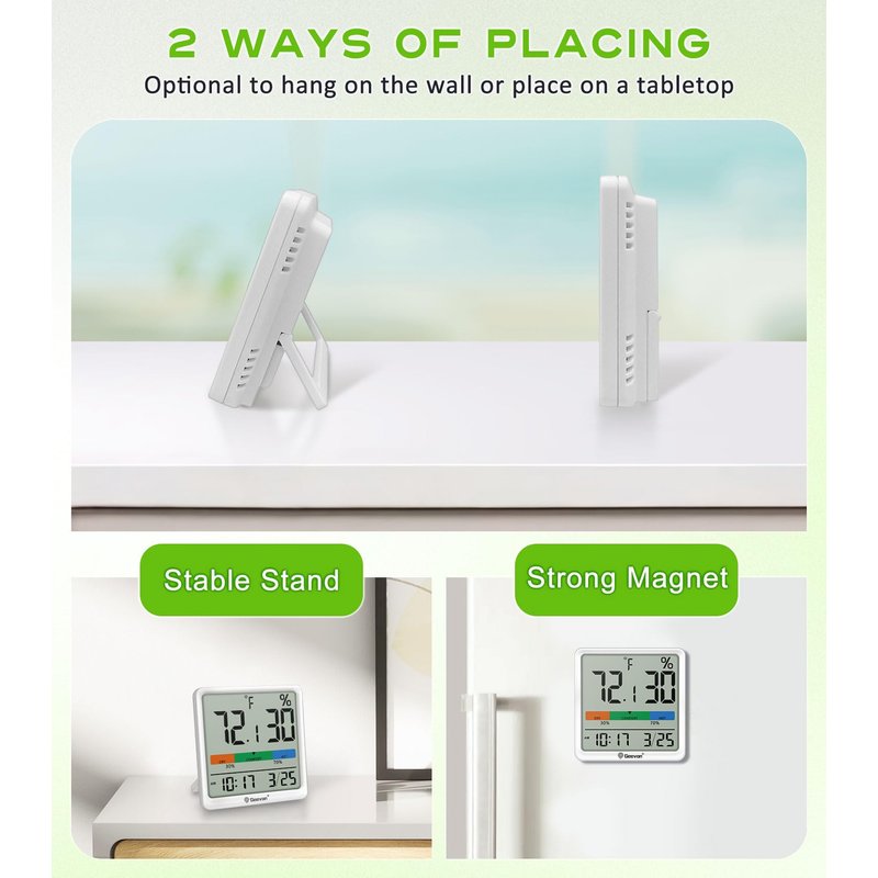 - Flexible Placement Options: Install effortlessly—no tools needed! Use the magnetic back for metal surfaces, place it on a desk, or mount it on a wall. Easily move between rooms or outdoor spaces like greenhouses