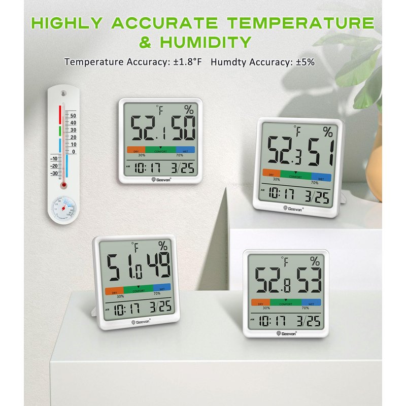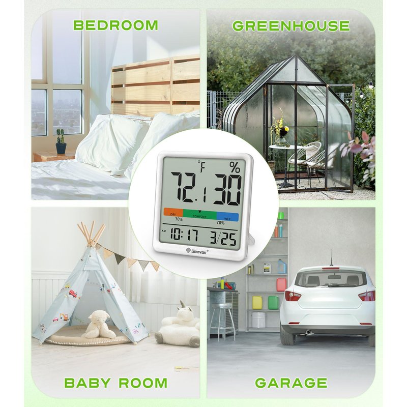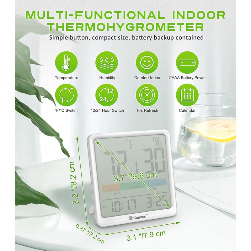 Geevon Digital Indoor Thermometer Hygrometer, Wireless Temperature Humidity Meter with Comfort Index, 1*AAA Battery, Calendar, Small Room Temperature Monitor for Home, Greenhouse, Bedroom, White