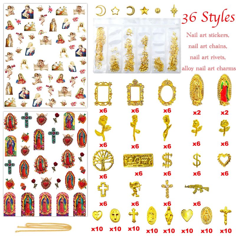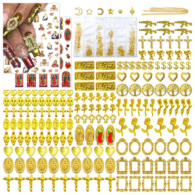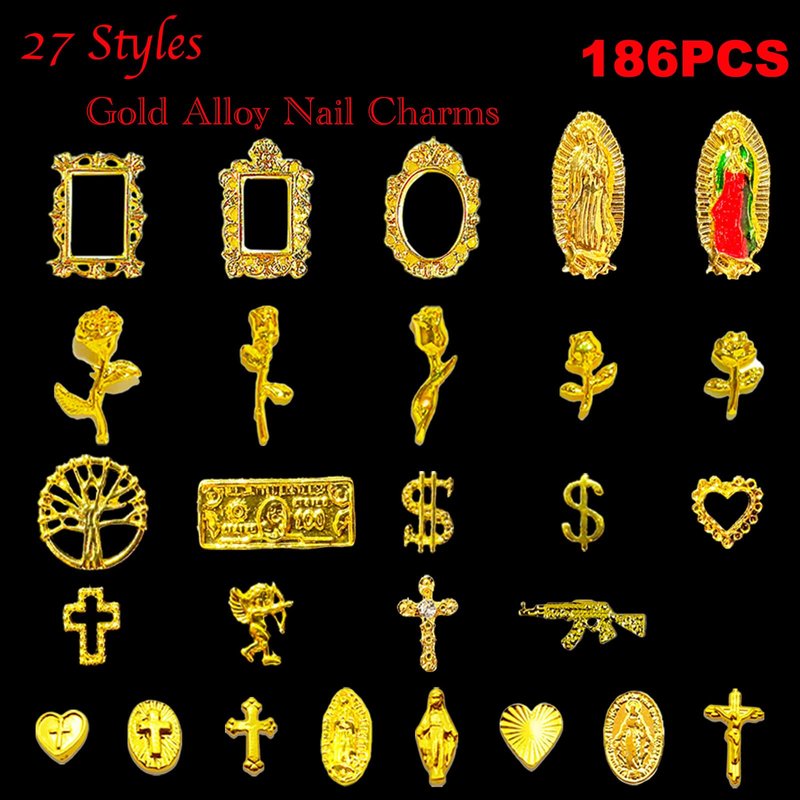 - 🌟36 Styles Nail Charms: 186pcs 3D gold alloy nail charms,two nail stickers,a nail art chain,A bag of nail rivets.Alloy nail charms Include cross,rose,frame Gothic,small gun,dollar sign,angel,heart,MINI Virgin Mary nail accessories.These nail charms come in a variety of styles to suit your many manicure needs.