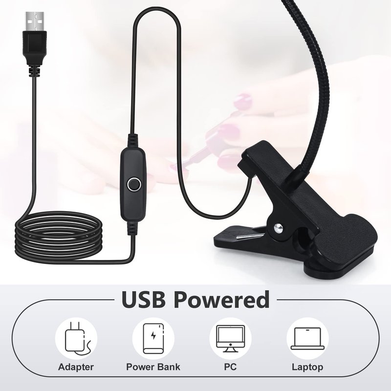 - 【USB Powered UV Light】: The uv nail dryer fixtures are adjustable lamps. UV nail light has 3W LED lamp beads, and portable clamp uv light for nail is of low power consumption with long life, at the same time uv lamp for gel nails is safe, environmentally friendly. Nail art lamp equipped with a control switch, gel nail lamp support all power supplies with USB charging, including computer host, mobile phone charger, etc.. UV nail lamp plug and play can be used for nail salon.