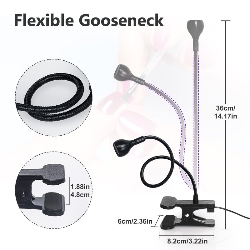 Welcome to the newly upgraded world of LED UV nail lamps! We are proud to introduce a powerful LED UV nail lamp for an unparalleled nail art experience. With the latest technology and advanced features, this professional-grade nail lamp makes it easy to achieve salon-quality nail art without leaving your home.Our nail lamp uses UV irradiation technology to ensure rapid curing of a variety of gel nail polishes, acrylics and other nail decorations. In just a few simple steps, you can create a flawless manicure in no time.Our nail lamp is uniquely designed with a flexible, twistable head. The light pailLed nail polish light stable base clamp can be applied to hang, clip and keep flat on the desk, gooseneck uv lamp for nails diverse ways to meet your different needs. Nail light for nail tech equipped with single chip LED, which uv light for nails is very suitable for fixing on the bedside table, desk, laptop table, headboard, etc.Our nail art light is compact and lightweight, making it perfect for carrying. Whether you have a manicure at home, or need to travel for business or pleasure, you can easily take it with you. You can carry the lamp in your handbag or suitcase and enjoy professional-grade nail care anytime, anywhere. You are no longer limited to the time and place of the nail salon, giving you the freedom to enjoy your beauty at your own pace.Our LED UV nail lamp is a powerful and high quality nail tool. Whether you are at home or traveling, you can always enjoy a professional-grade nail art experience. Our LED UV nail lamp is a good choice for you. Start enjoying a quality nail experience!