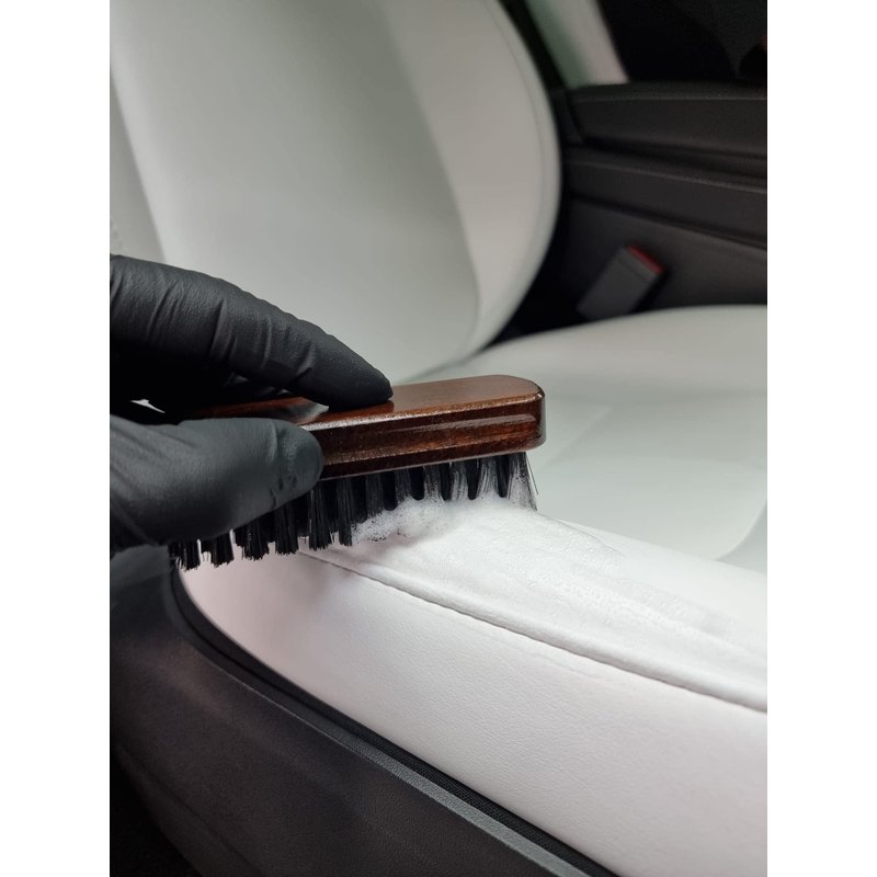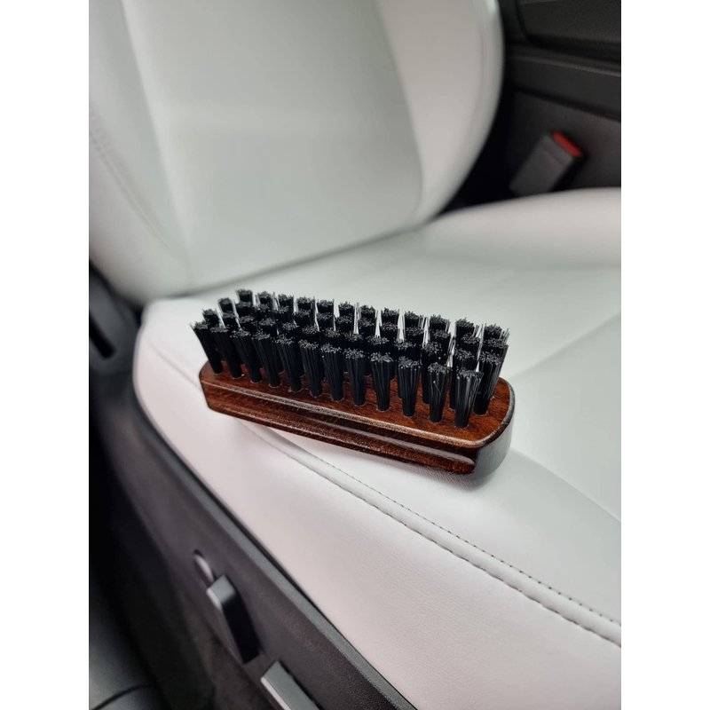 Geist. Leather & Upholstery cleaning brush is a perfect addition to your car detailing and home cleaning tools. Cleaning leather with a microfibre cloth or towel and a cleaner does'nt always lift all the dirt stuck in the grain and pores of leather. It is the perfect size – small enough to get into tight and hard to reach areas allowing you to clean build up of dirt and soiling from every nook and cranny. While perfect for detailing car interiors, cleaning sofas and leather furniture, this versatile brush is also great for cleaning cloth seats, upholstery, small leather goods, boots, sneakers and lots more. Spray a safe-to-use leather cleaner of your choice or use Geist. Rapid Leather & Vinyl Cleaner on the surface and gently scrub the leather in circular motions to lift the soiling from the grain. Wipe down residue with a clean cloth or rag and return the leather to its new look optics and touch. For best results, clean one panel at a time from seam to seam. This brush is made with synthetic bristles that are stiff enough to lift dirt and grime from the leather texture but not so stiff that they mark the surface. 20 mm long synthetic bristles are densely and securely packed into a solid wooden handle – the bristles do not shed and make cleaning quick and easy. Why synthetic bristles? - Brushes with natural bristles are soft and generate heat when rubbed on a surface. Thus making it ideal for polishing shoes which are a smooth leather surface but not that effective for cleaning a textured surface. How to clean the brush itself? - Rinse with warm water and dish soap. Dry wooden handle immediately with a rag.