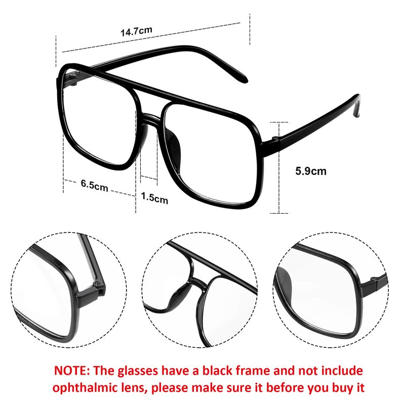 - 80's Sunglasses: the lightweight frame is made of polycarbonate and acrylic material, durable to use; Size: lens width is 65 mm/ 2.56 inch, lens height is 59 mm/ 2.32 inch, the bridge is 15 mm/ 0.59 inch, and arm measures 147 mm/ 5.79 inch, great for men and teens; Note: the glasses have a black frame and not include ophthalmic lens, please make sure it before you buy...
