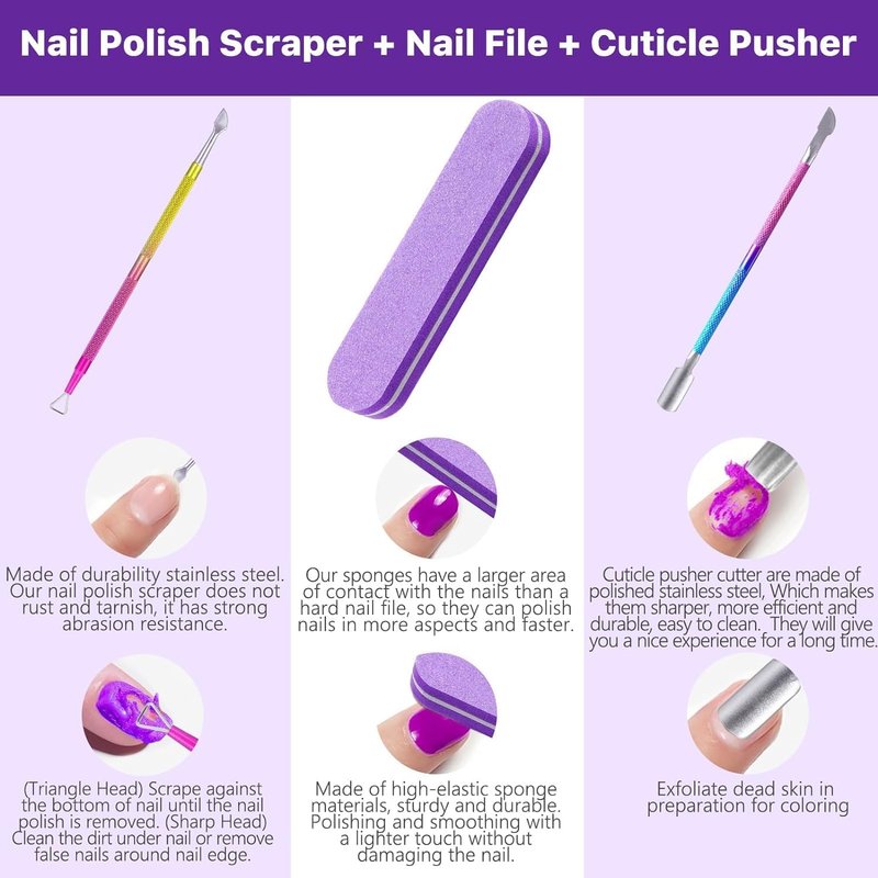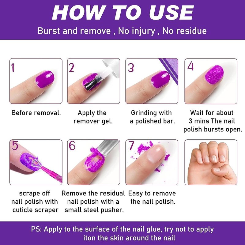 - Easy to Remove - Just grind the surface of nails with the provided nail files, then apply the gel nail polish remover as if you were applying nail polish, wait 3-5 minutes for the surface of the nail to burst automatically, then gently remove with a small steel pusher.