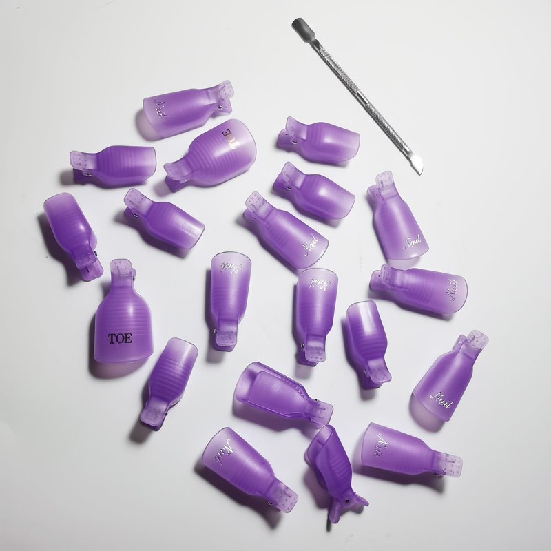 Gel Nail Polish Remover Clips, 20Pcs Nail Art Soak Off Cap Clips, Plastic Resuable Finger and Toe Nail Clips Set with Double Ended Metal Cuticle Pusher for Polish Remover, Purple